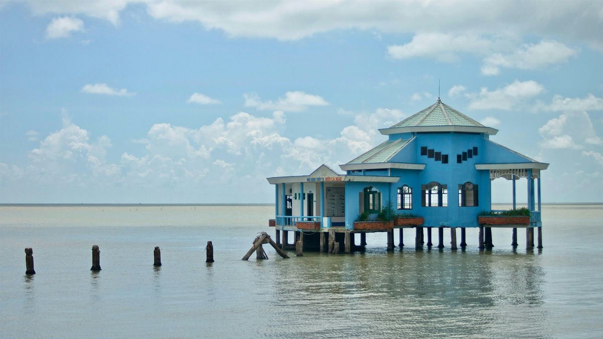 Bâtisse d'un restaurant abandonné situé à la pointe sud du delta du Mékong au Vietnam, une localité dénommée Mui Ca Mau, le 12 octobre 2019. Credit © Clara Jullien