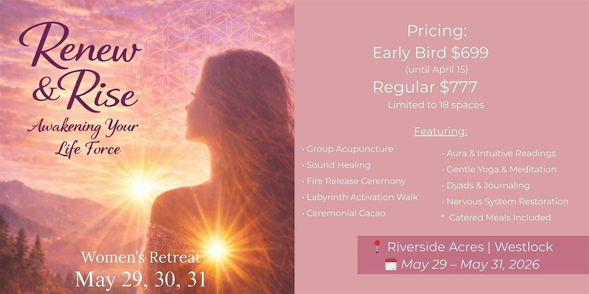 As the earth thaws and light returns, so do you.Renew & Rise is a sacred spring immersion designed to awaken your vital life force, clear stagnation, and activate the seeds within you that are ready to bloom.Held in the serene beauty of Riverside Acres in Westlock, you’ll stay in cozy cabins nestled into the land, gather in an open-air community space, and share nourishment from a warm and welcoming yurt kitchen. All meals are lovingly catered so you can fully rest, receive, and rise.This women’s-only retreat is guided by Kelly, Kris, and Jaide, weaving together ancient wisdom, seasonal energetics, and modern nervous system science to support your transition into empowered yang expansion.Spring in Traditional Chinese Medicine is governed by the Liver — the organ of flow, vision, and forward movement. When clear, it brings direction, vitality, and courage. When stagnant, it manifests as frustration or fatigue.This weekend is designed to restore flow.Retreat Experiences Include:• Group Acupuncture