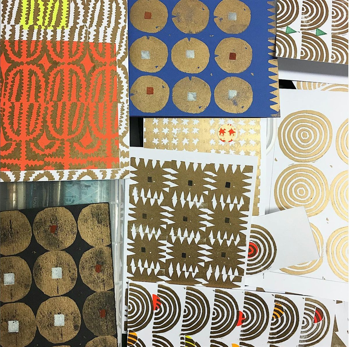 Make your own blocks from rubber or lino and use them to create repeat patterns on hangings, sample squares, hankies or scarves, and paper and card. Add ink rubbings from textured surfaces for your own unique designs.