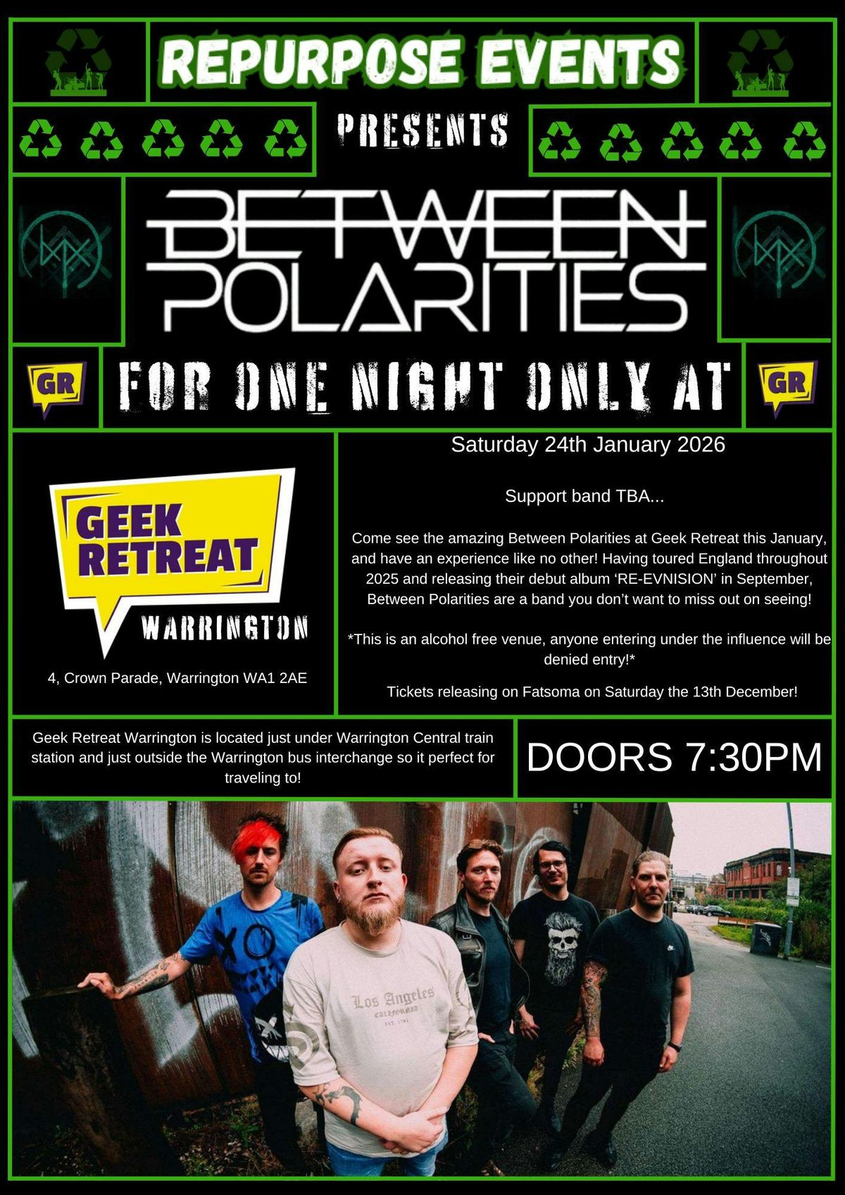 Repurpose Events presents: Between Polarities! 🦇🖤For one night only in Warrington's very own Geek Retreat, on the 24th of January 2026! 🤟Support band to be announced at a later date!Doors 7:30PM!!!*Disclamer*Geek Retreat Warrington is an alcohol free location!WE HOPE TO SEE YOU THERE!!!♻♻♻Disclaimer: