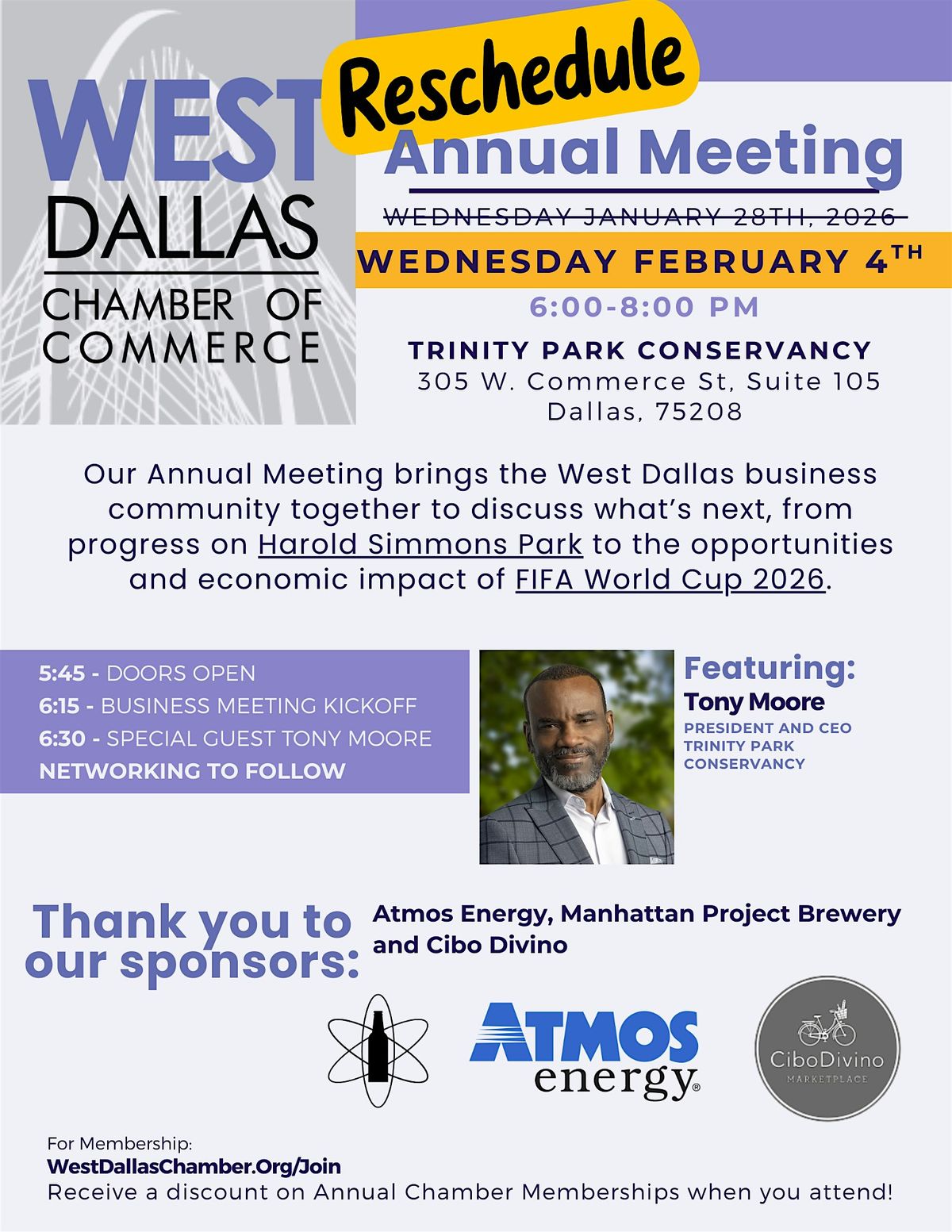 The West Dallas Chamber of Commerce invites you to join us for our Annual Meeting, an evening dedicated to connection, momentum, and the future of our community. This gathering brings together business owners, civic leaders, and community stakeholders to reflect on progress and look ahead to the opportunities shaping West Dallas.
