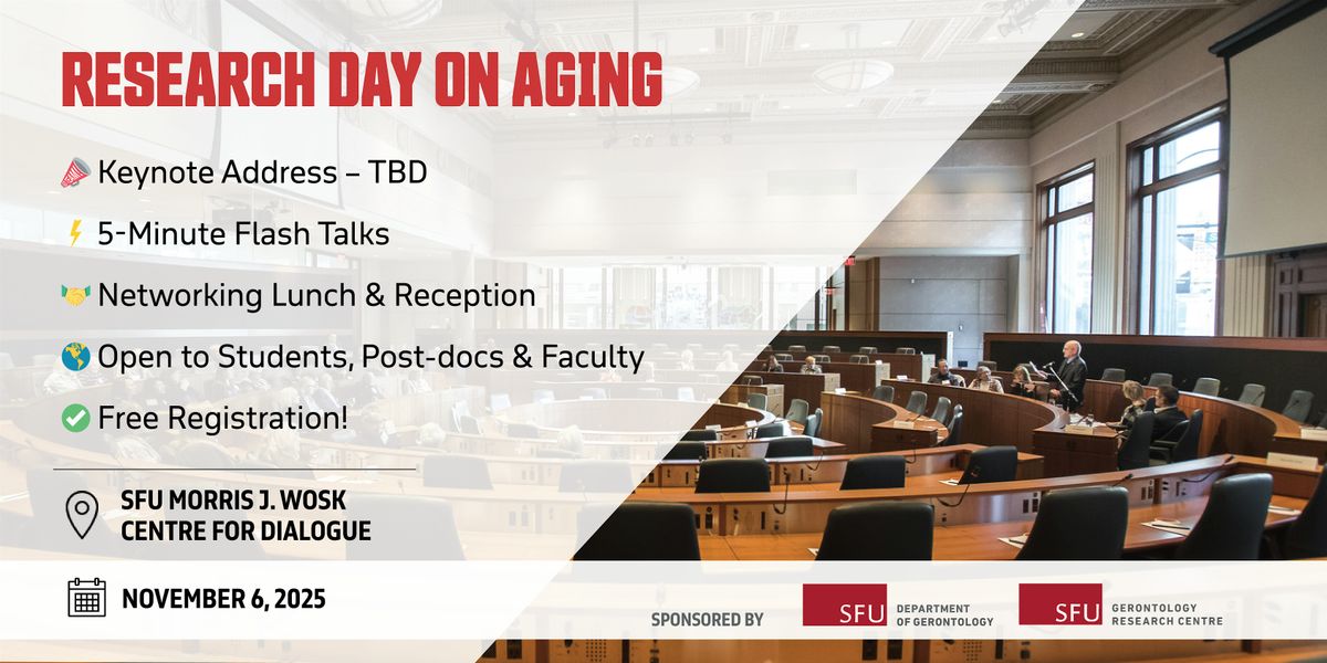 Simon Fraser University's Gerontology Research Centre invites you to the Research Day on Aging. This free event will take place on Thursday, November 6, 2025, from 9:00 am - 5:00 pm (PT) at the SFU Morris J. Wosk Centre for Dialogue. Join us for this university-wide celebration of interdisciplinary research and innovation in the field of aging. This event brings together students, post-doctoral fellows, and faculty from across all faculties and disciplines at SFU to explore cutting-edge research on aging, longevity, and older adult well-being.