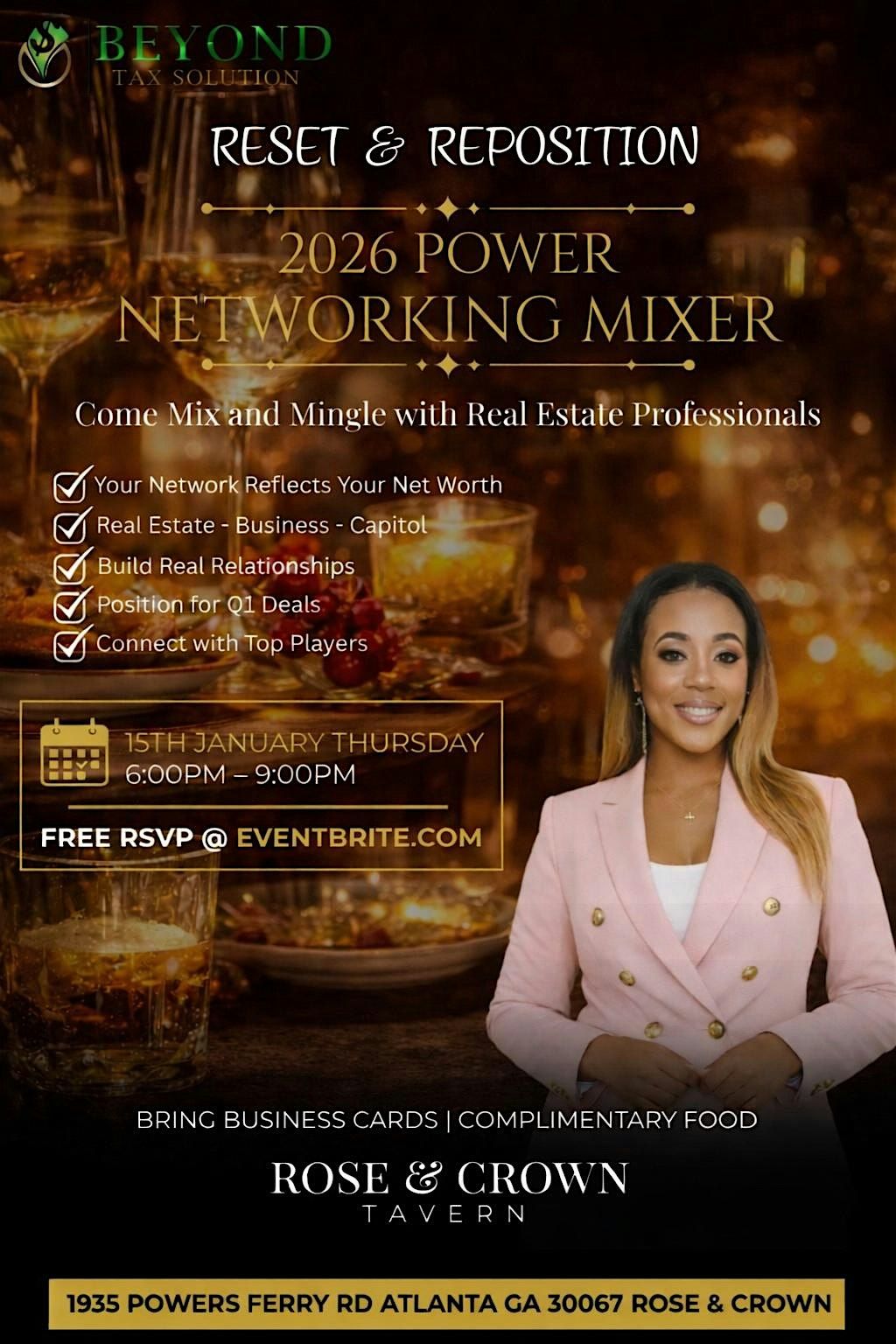 Join Beyond Tax Solution for the 2026 Power Networking Mixer – Reset & Reposition, an exclusive evening designed for real estate professionals, entrepreneurs, investors, and business leaders ready to elevate their network and their net worth.