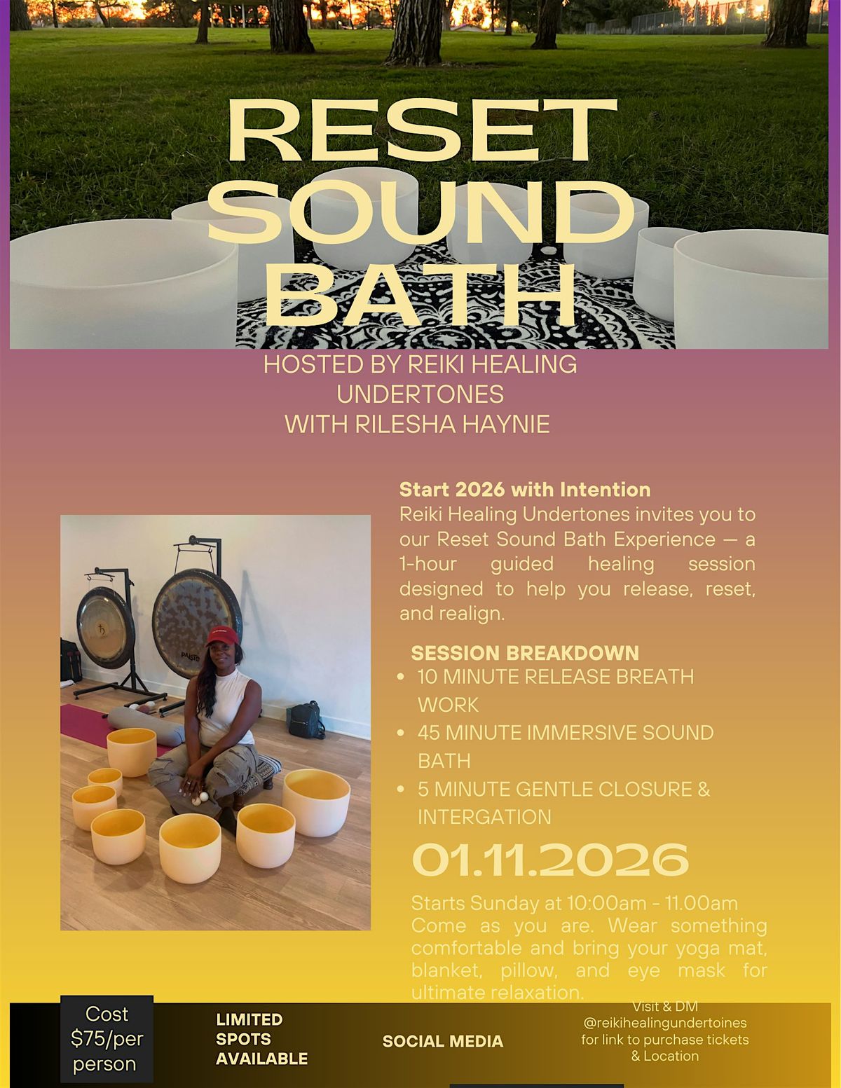 Join us for an in-person outdoor experience ! Ready to unwind and reset your mind? Join us for an amazing sound bath Reiki Healing Undertones in Riverside Ca ( Location provided soon). Inviting you to our Reset Sound Bath Experience in a 1-hour guided healing session designed to help you release, reset, and realign.