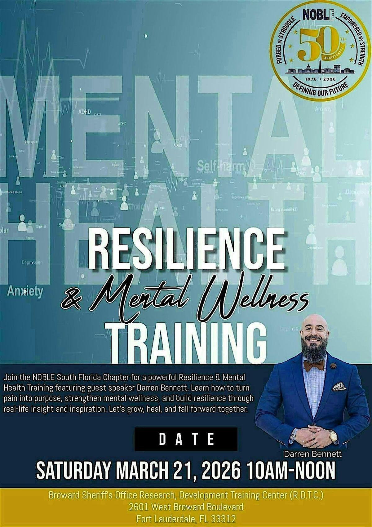 Join the NOBLE South Florida Chapter for a powerful Resilience & Mental Health Training featuring guest speaker Darren Bennett. Learn how to turn pain into purpose, strengthen mental wellness, and build resilience through real-life insight and inspiration. Let’s grow, heal, and fall forward together.