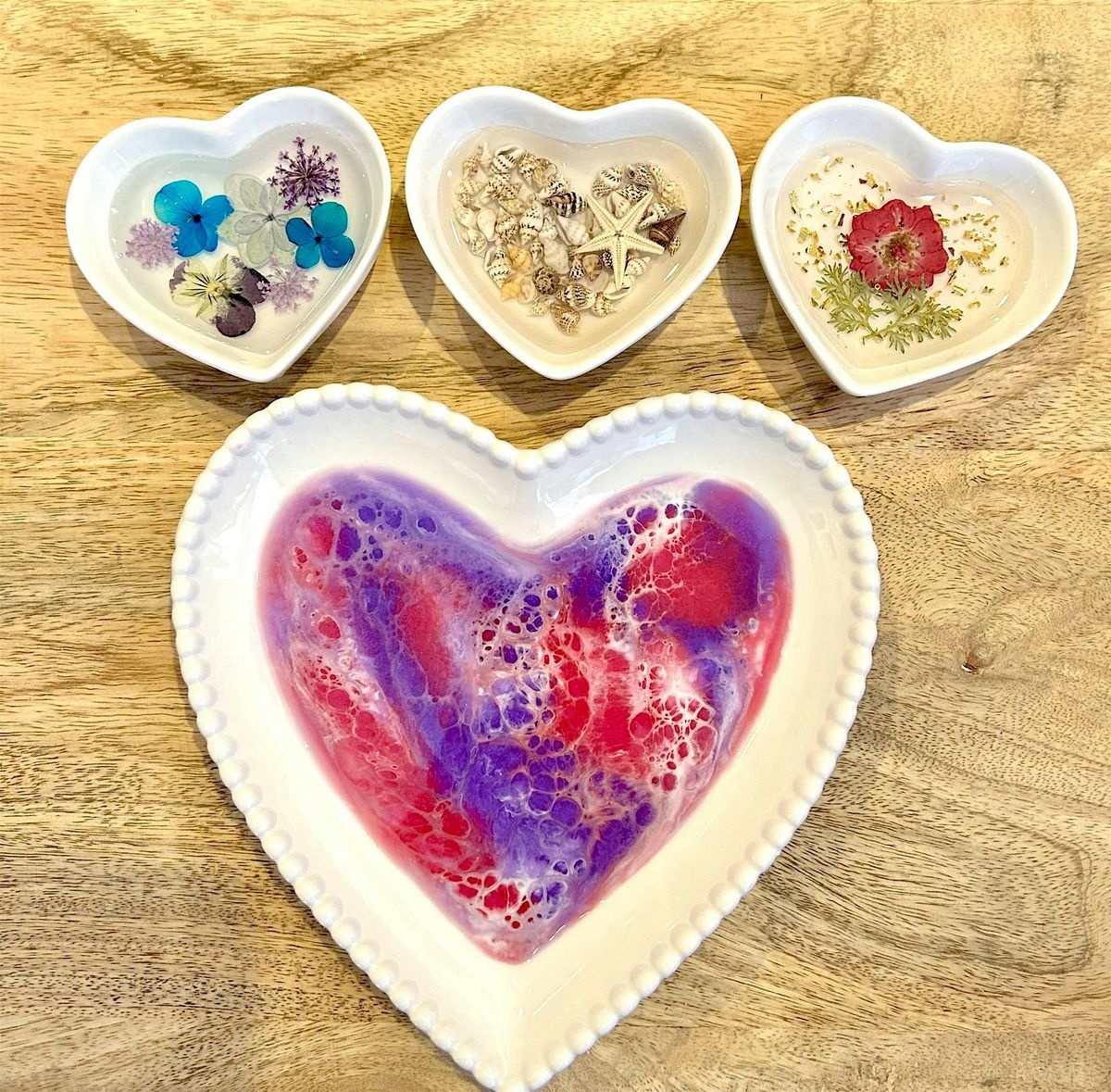 Just in time for Valentine’s Day, create beautiful resin heart dishes! In this 90-minute workshop, Stacey and Heather will teach you about epoxy resin and how to use it to create gorgeous, functional works of art. You’ll receive instruction on how to prepare and color the resin, and will have the option to add embellishments of your choice, such as dried pressed flowers, seashells and glitter.
