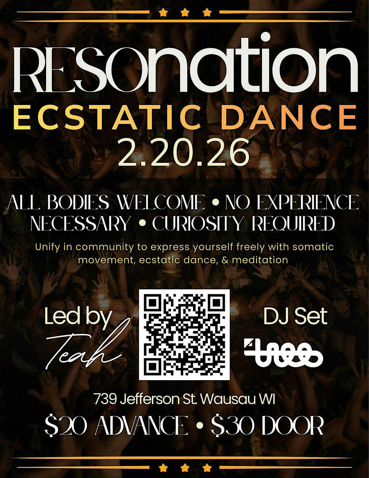 Join the community for ecstatic dance, somatic movement, and guided meditation in an intentional healing space. Wear something comfortable, bring a yoga mat and be prepared to move!