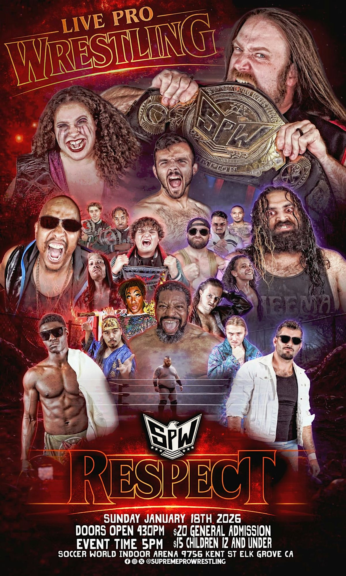 Supreme Pro Wrestling returns to Soccer World Indoor Arena in Elk Grove, CA on Sunday, January 18th for our first event of 2026, Respect.