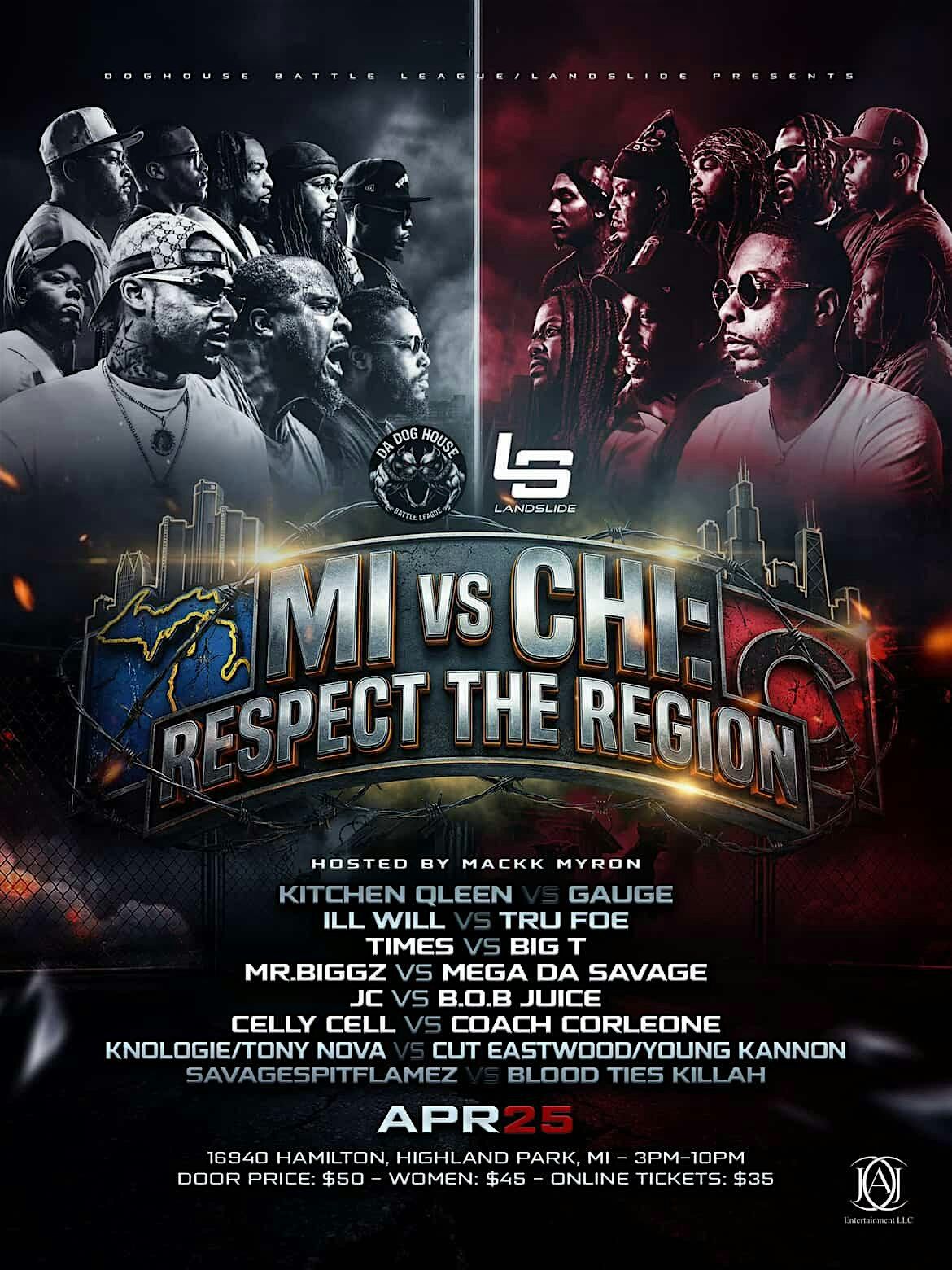 April 25 Dog house battle league presents Respect the Region the official Chicago vs Mi battle rap card live @ the vault