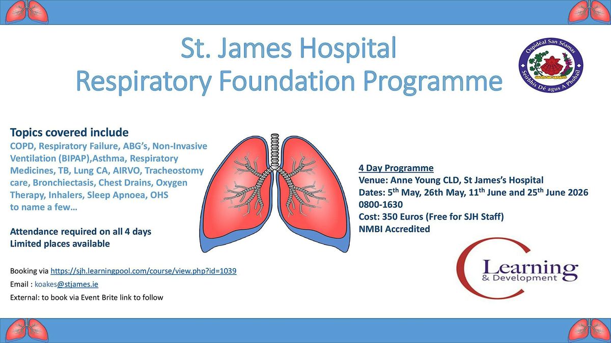 Are you a healthcare professional looking to enhance your respiratory care skills? Join our 4-day Respiratory Foundation Programme at St. James’s Hospital. This NMBI-accredited course provides essential knowledge and hands-on training in COPD, respiratory failure, ABGs, BIPAP, asthma, tracheostomy care, chest drains, oxygen therapy, and more.