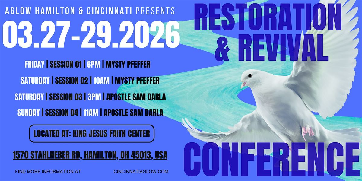 Join Aglow Hamilton and Aglow Cincinnati for our Restoration & Revival Conference with guest speakers Mysty Pfeffer & Apostle Sam Darla for a supernatural encounter that will ignite your spirit, transform your body, and revolutionize your understanding of divine health! The Restoration & Revival Conference isn't just another wellness event - it's a Kingdom-powered activation of your God-given authority over sickness and disease.