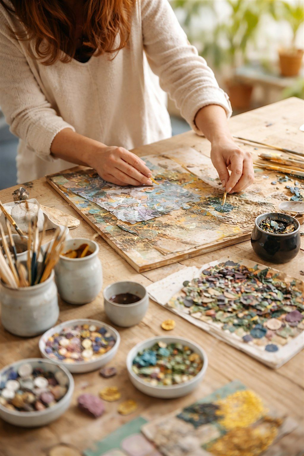 Our studio provides access to a rich and evolving library of materials, including watercolor, mixed media, fiber arts, mosaic, clay, and specialty tools. Each session is intentionally designed to help you step away from the pace of daily life and enter a quieter, more grounded creative rhythm.