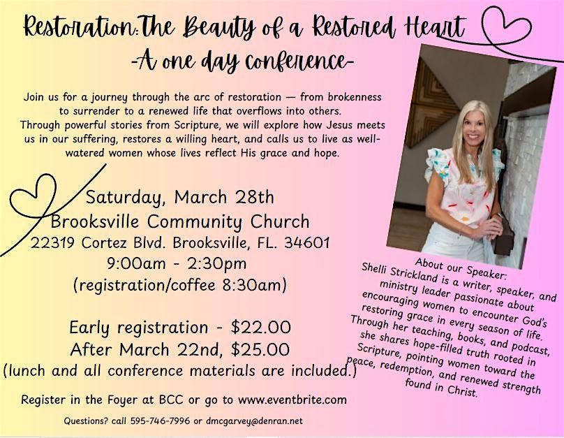 Join us for a three-session journey through the arc of restoration — from brokenness to surrender to a renewed life that overflows into others. Through powerful stories from Scripture, we will explore how Jesus meets us in our suffering, restores a willing heart, and calls us to live as well-watered women whose lives reflect His grace and hope.