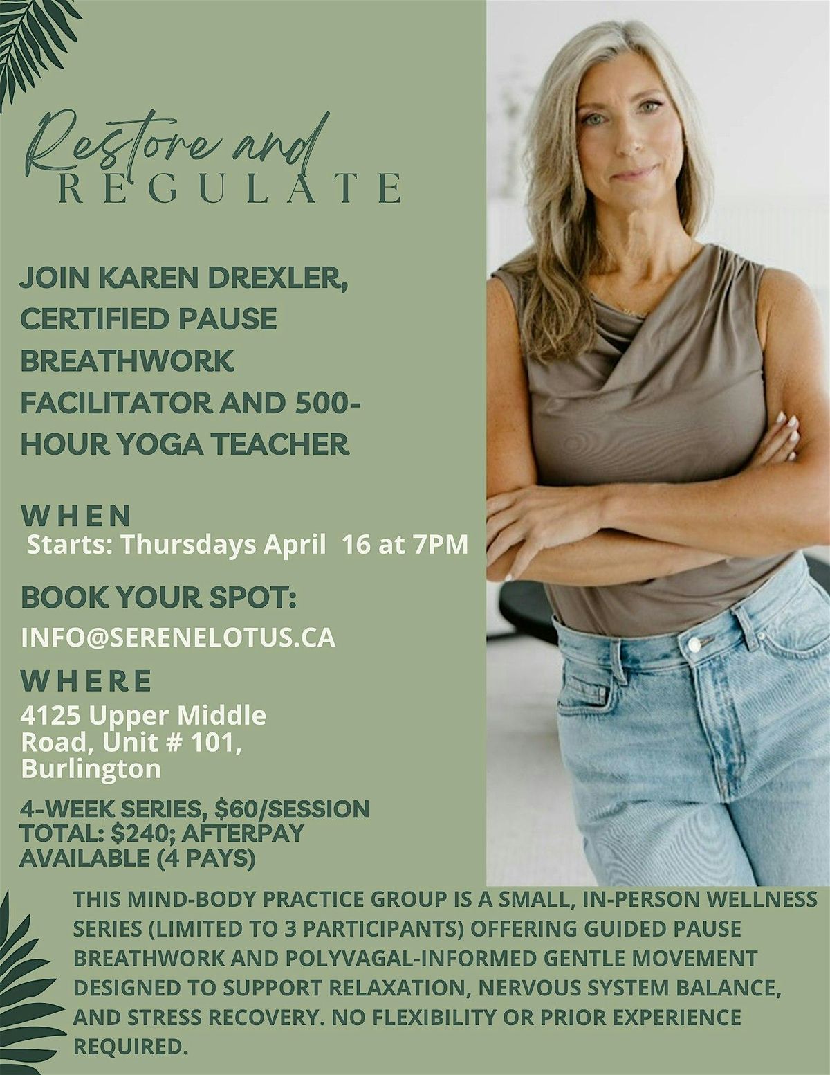 Small, in-person mind–body group focused on supporting nervous system balance and stress recovery; 4-week series (3 participants).