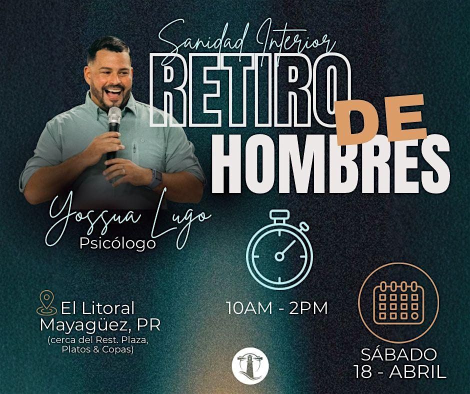 Les invitamos al Retiro de Hombres (2026). Es de sanidad interior y para todos los Hombres que quieran asistir. Es sin costo (Gratis). Nos acompañara el Pastor y Psicólogo Yossua Lugo y en las alabanzas el Evangelista Edwin González. En la Playa del Litoral cerca del negocio Platos y Copas en Mayagüez, PR. De 10 am hasta las 2:30 pm. ¡Les esperamos! Tel: 787 452-8139. Gracias y Dlbm a todos. Amén.