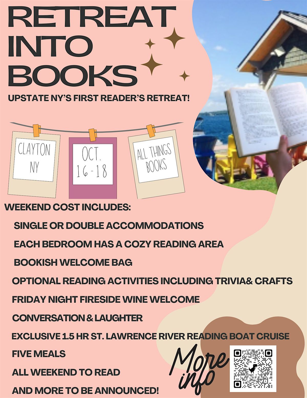 Join other readers and bibliophiles for a weekend of reading, relaxation and bookish fun! Your stay includes two nights’ accommodation at Chateau Country Inn on the St. Lawrence River; curated reading and relaxation activities Friday through Sunday; five meals, including an author attended private dinner and lunch on Saturday that you can take (along with your book!) on a private retreat-only boat tour of the Thousand Islands. Participate in as many or as few curated retreat activities as you like, they are all included in the price!