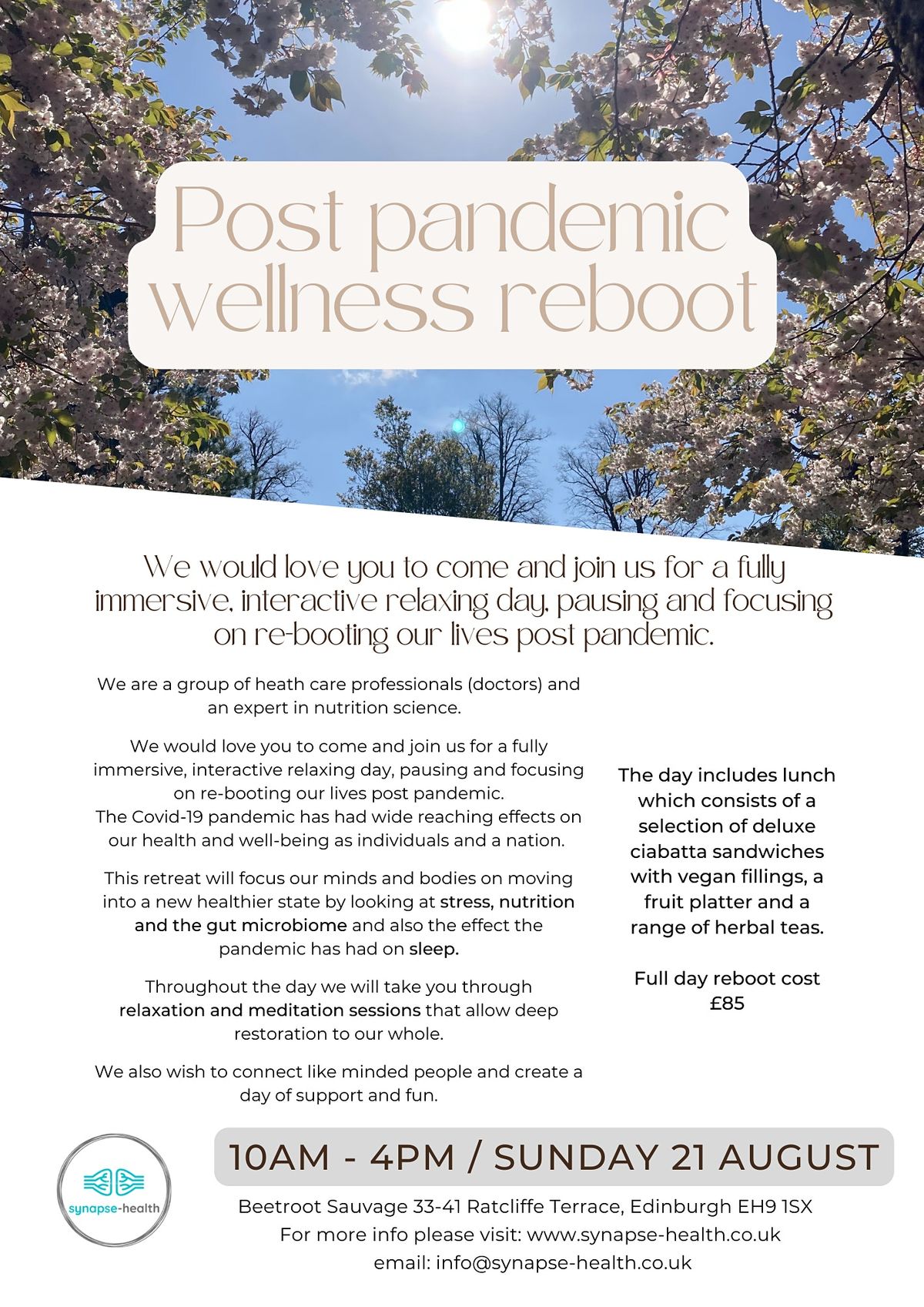 We would love you to come and join us for a fully immersive, interactive relaxing day, pausing and focusing on re-booting our lives post pandemic.