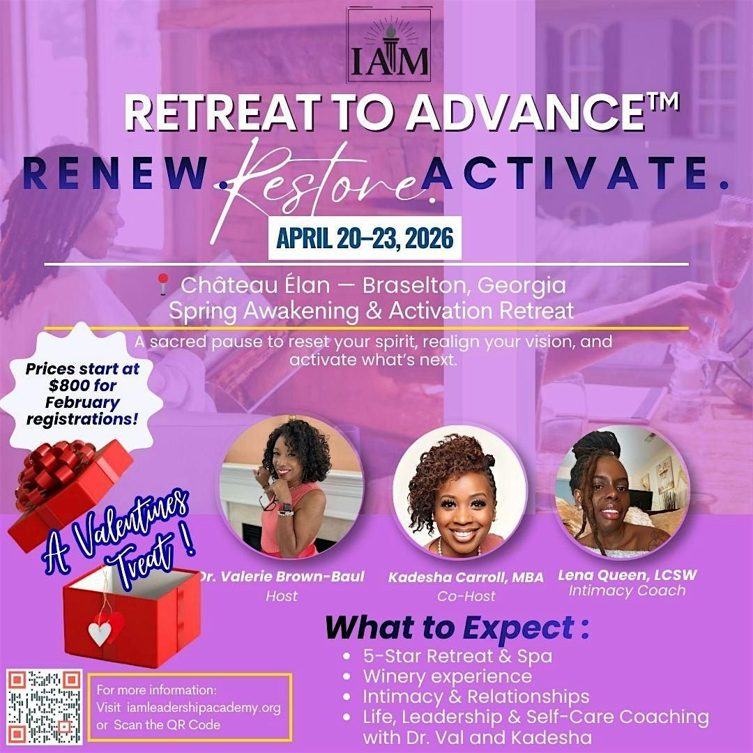 Welcome to the Retreat to Advance™ event! Join us from April 20–23, 2026 at the Chateau Elan Winery & Resort for a transformative experience. Get ready to Renew, Restore, and Activate your mind, body, and spirit with Valerie, Kadesha, and Queen!