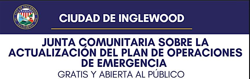 La Oficina de Manejo de Emergencias de la Ciudad de Inglewood le invita a asistir a la Reunión Comunitaria del Distrito 1 como parte del proceso de desarrollo del Plan de Operaciones de Emergencia de la Ciudad.