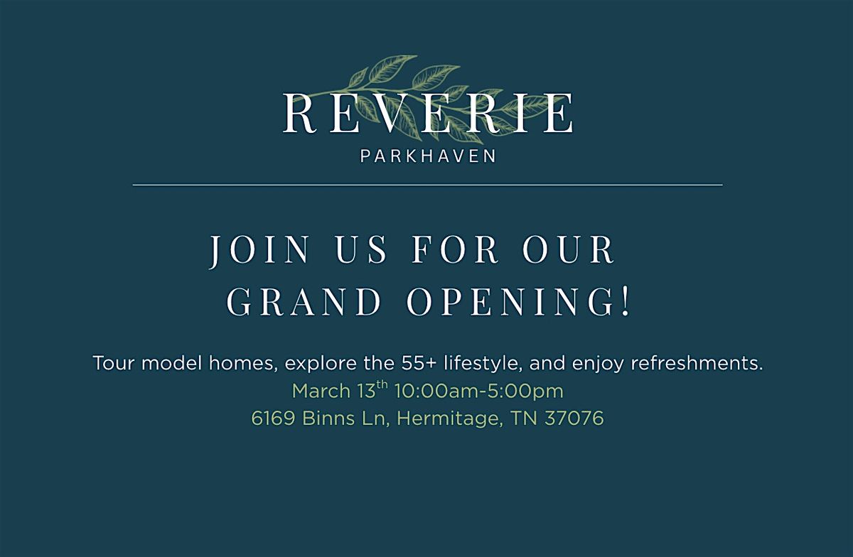 Join us for the Grand Opening of Reverie at Parkhaven. Tour model homes, explore the lifestyle, and experience 55+ living.