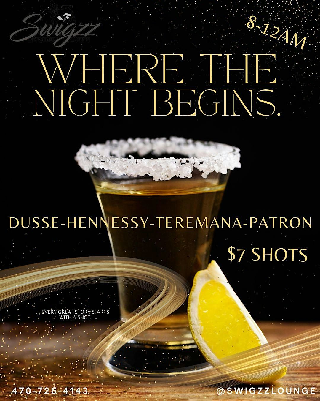 Where weeknights feel like weekends - $7 top-shelf favorites. Because the party doesn’t wait for Friday! Monday - Thursday 8-12. Dusse - Teremana Repo Silver - Hennessy - Patron Silver