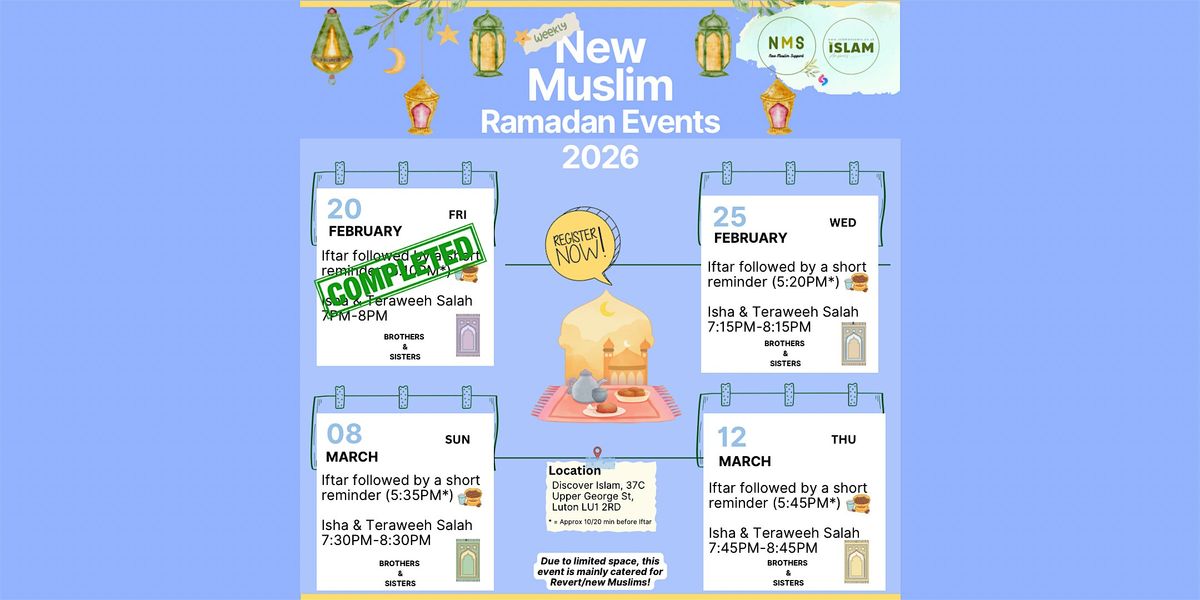Welcome to the **Revert/New Muslim Iftar & Teraweeh** event happening on **Thursday 12th Mar**! Join us at **Discover Islam** on Upper George Street in Luton, UK for an evening of delicious food and spiritual connection. The event starts at **17:45 GMT** so make sure to arrive on time. Whether you're a new Muslim or a revert, this is a great opportunity to meet others in the community and enjoy the special atmosphere of Ramadan. Don't miss out on this chance to break your fast and pray together. See you there!