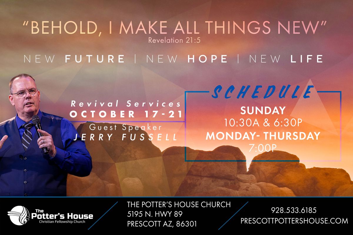 Join us the week of October 17-21 at The Potter's House Church for revival services with Evangelist Jerry Fussel. Come hear a word from heaven and receive a miracle!