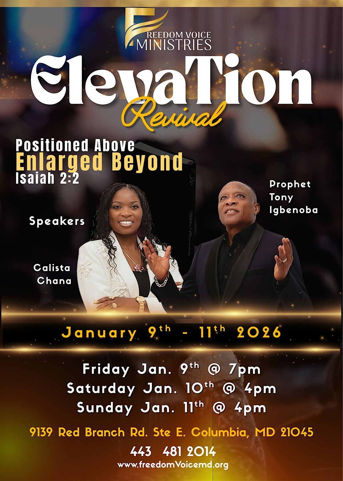 Elevation Revival is a powerful time of renewal, worship, and spiritual awakening as we prepare for the new year of harvest, elevation, and expansion. This gathering is designed to strengthen faith, ignite vision, and position hearts for what God is about to do next.