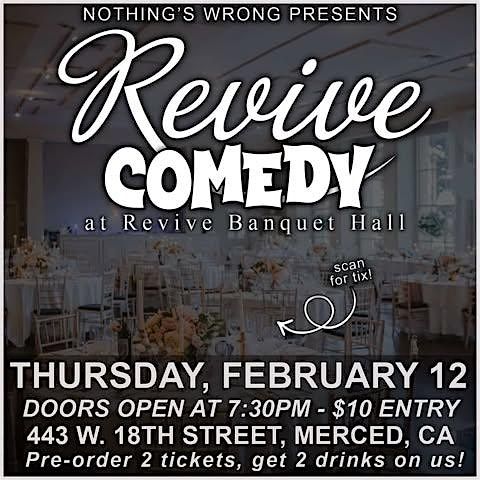 Get ready to laugh until your sides hurt at the Revive Comedy Showcase by Nothings Wrong! Join us at 443 W 18th St on February 12, 2026 at 7:30 PM (Pacific Time) for a night of hilarious stand-up comedy. You won't want to miss this event filled with laughter and good vibes. See you there! Pre-Order 2 Tickets, Get 2 Drinks on us