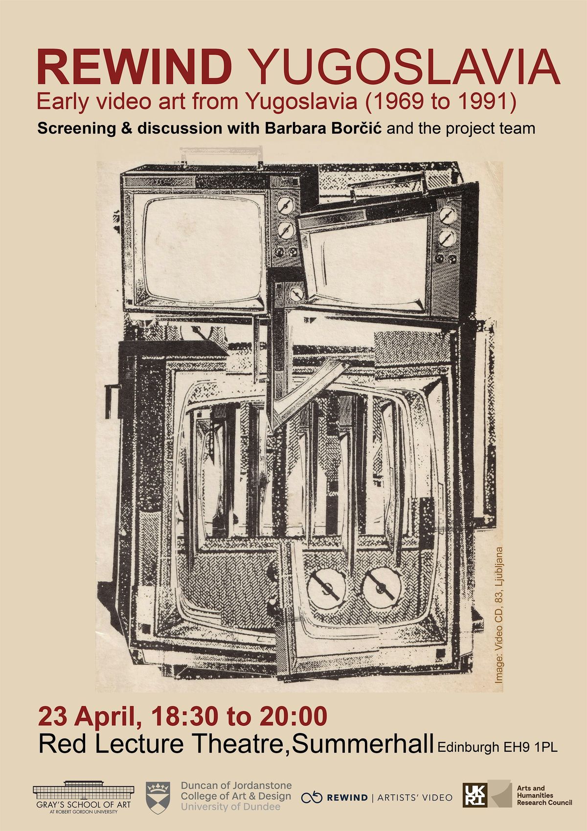 Rewind Yugoslavia is an AHRC-funded project conducting research into video art histories in the former Yugoslavia between 1969-91. In this event, the project team from Robert Gordon University, Aberdeen and DJCAD, University of Dundee, will be joined by Barbara Borčić, media art historian and curator from Ljubljana. The panel will introduce and discuss their latest research and show work from Slovenia, Croatia and Macedonia. Join us to see rare and little-known video works from Yugoslavia and to hear more about the project’s work and future outcomes.