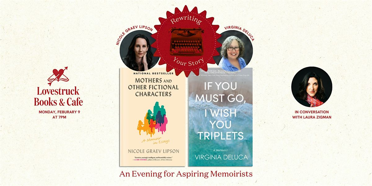Have a story you’ve been meaning to write or rewrite? Join us for a thoughtful, inspiring evening with memoirists Nicole Graev Lipson and Virginia DeLuca as they talk about shaping the stories we inherit, the ones we survive, and the ones we choose to tell.