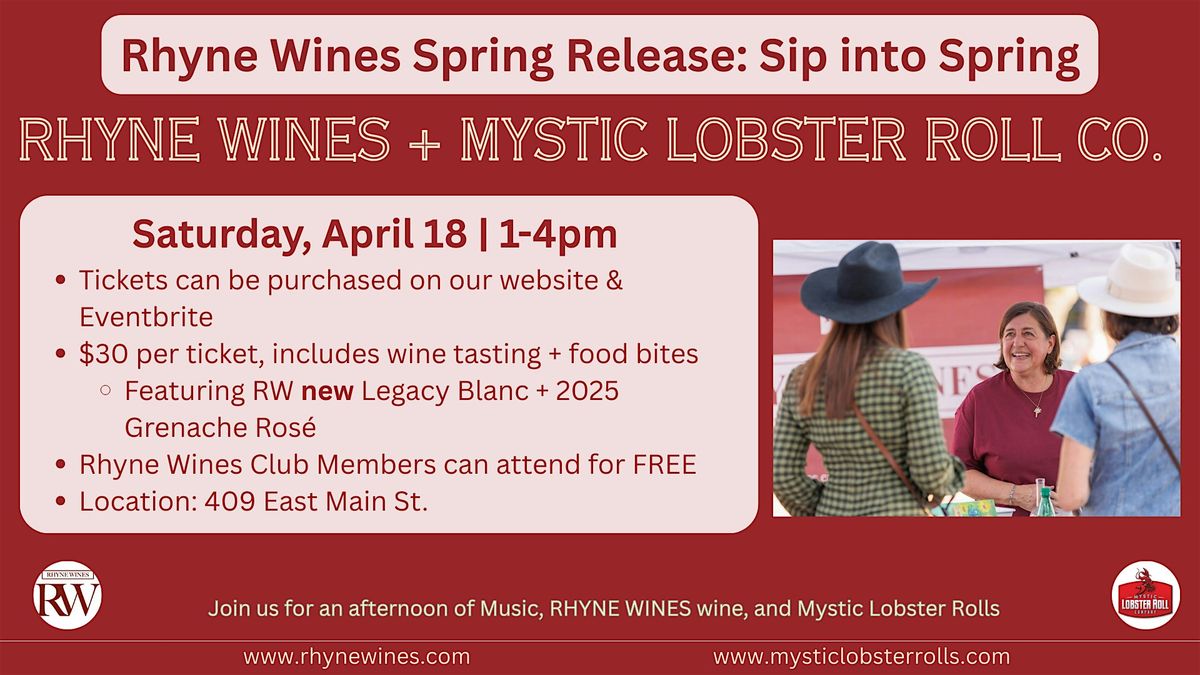 Each ticket holder will be given samples of Rhyne Wines's newly released 2024 Legacy White and 2025 Grenache Rosé. There will be complimentary food bites to accomany each wine - made by Mystic Lobster Roll Co.