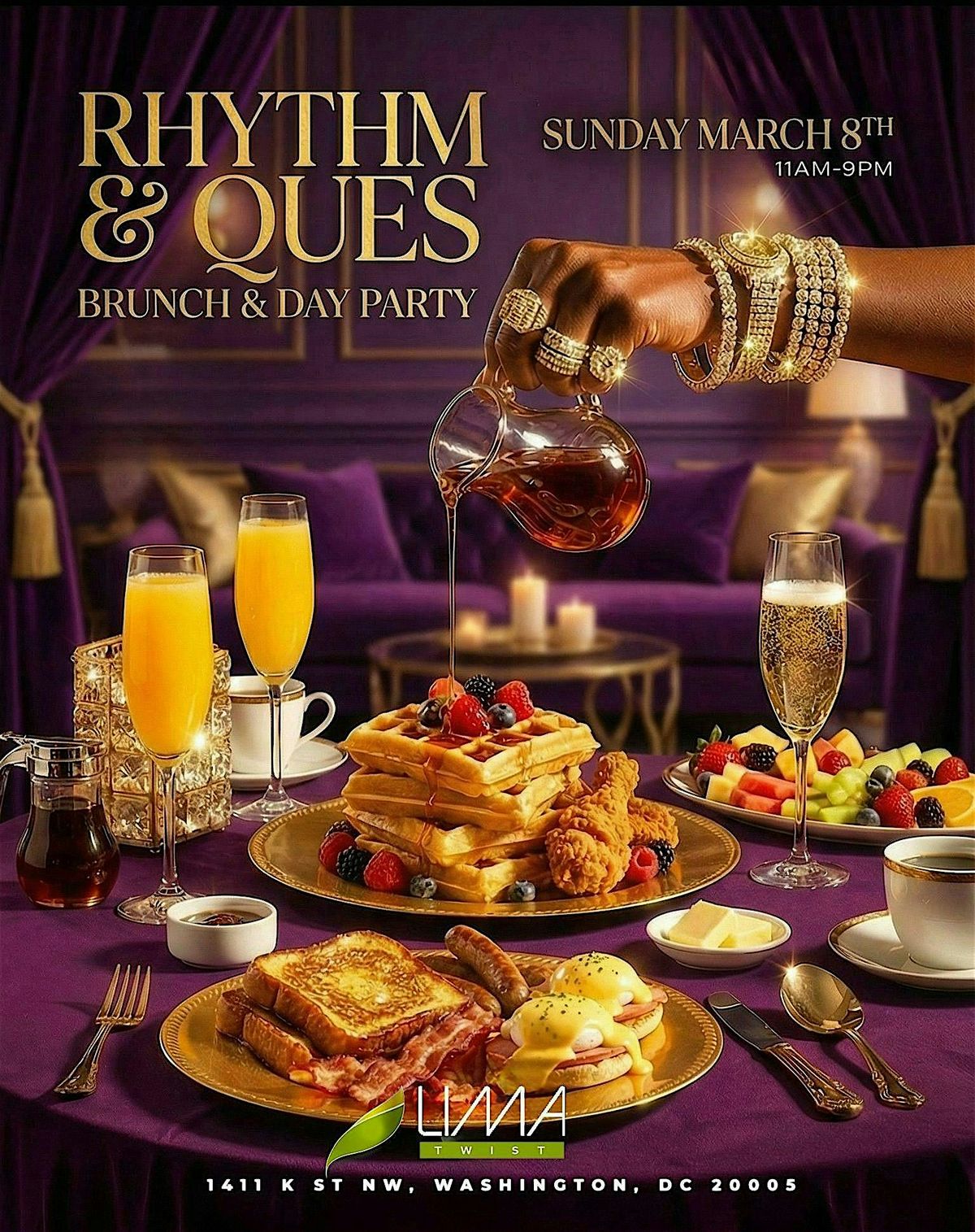 Rhythm & QUES blends throwback anthems, smooth R&B, hip-hop classics, and feel-good party records with elevated brunch favorites and crafted cocktails. It’s for the ones who appreciate a good playlist, know every word to the 2000s hits, and still want to be home at a respectable hour.