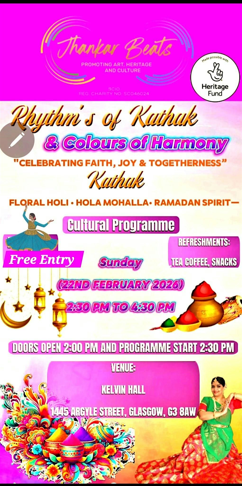 Get ready to dive into the Rhythms of Kathak brings communities together by celebrating Holi, Hola Mohalla, and Ramadan through dance, music, and shared stories. The event highlights cultural harmony, diversity, and mutual respect, creating a vibrant space where traditions connect, creativity flourishes, and people celebrate unity beyond differences ! Join us for an in-person experience filled with graceful movements, captivating rhythms, and stunning storytelling.
