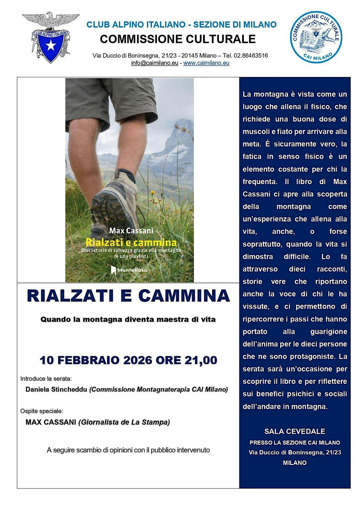 La serata sarà introdotta da Daniela Stincheddu, responsabile della Commissione Montagnaterapia del CAI Milano, e proseguirà con uno scambio di opinioni con il pubblico.