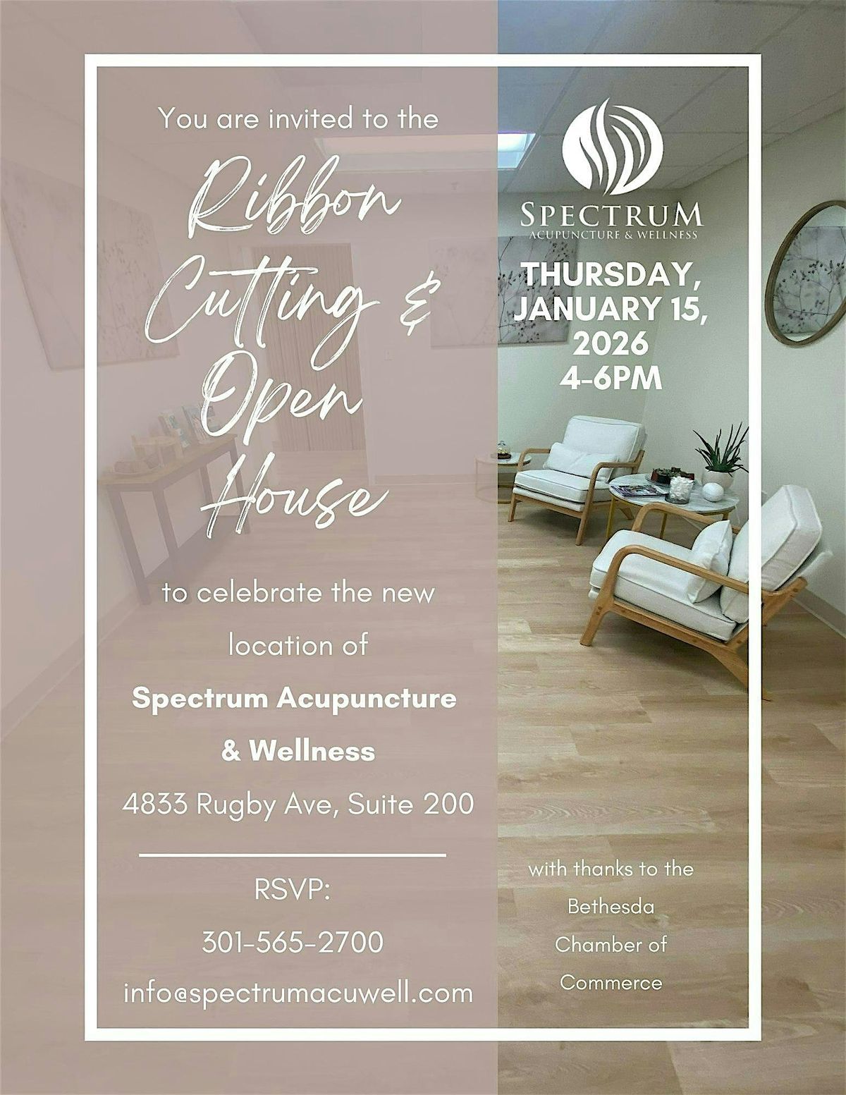 Ribbon Cutting at 4:30 PM There will be door prizes, some giveaways and raffle items. Lite fare & beverages will be served. To help us plan, please text your RSVP to the office: 301-565-2700