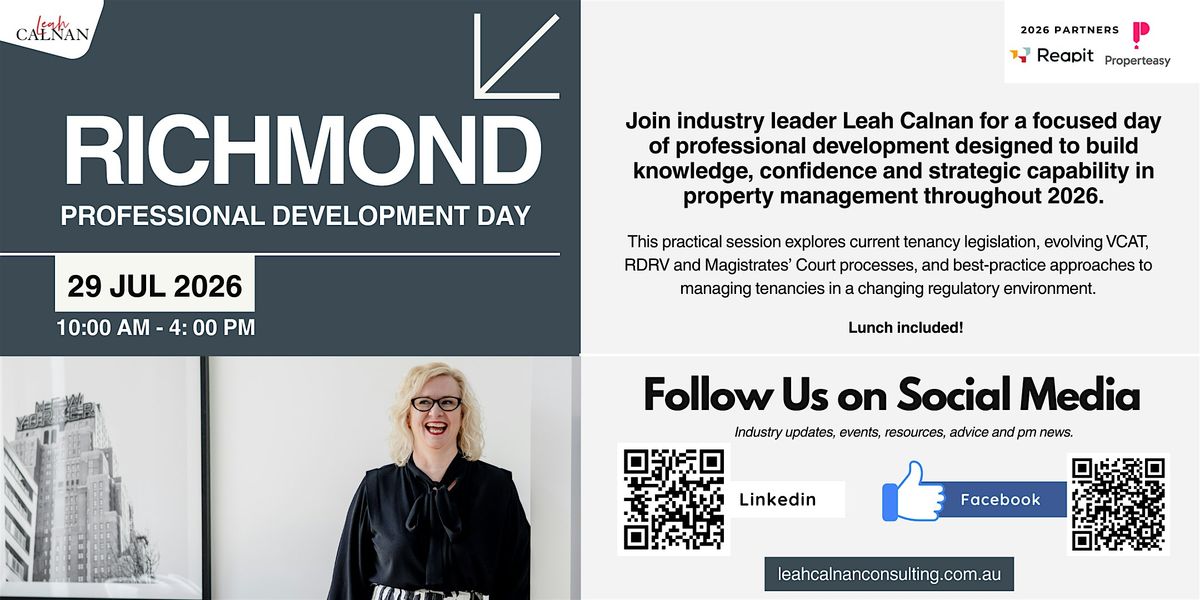 Join industry leader Leah Calnan for a focused day of professional development designed to build knowledge, confidence and strategic capability in property management throughout 2026.