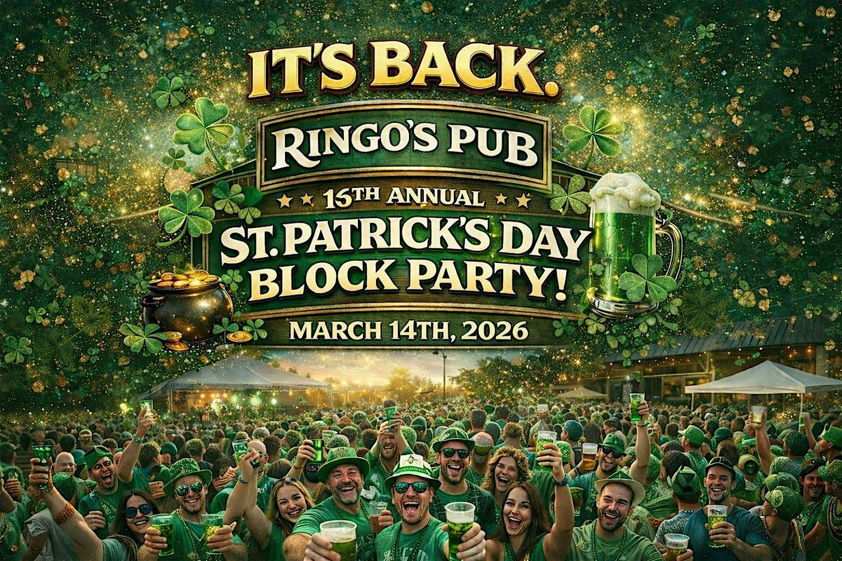 IT’S BACK! ☘️ Ringo’s Pub’s 15th Annual St. Patrick’s Day Block Party — green beer, live music & epic vibes. March 14. Shops at Legacy East.