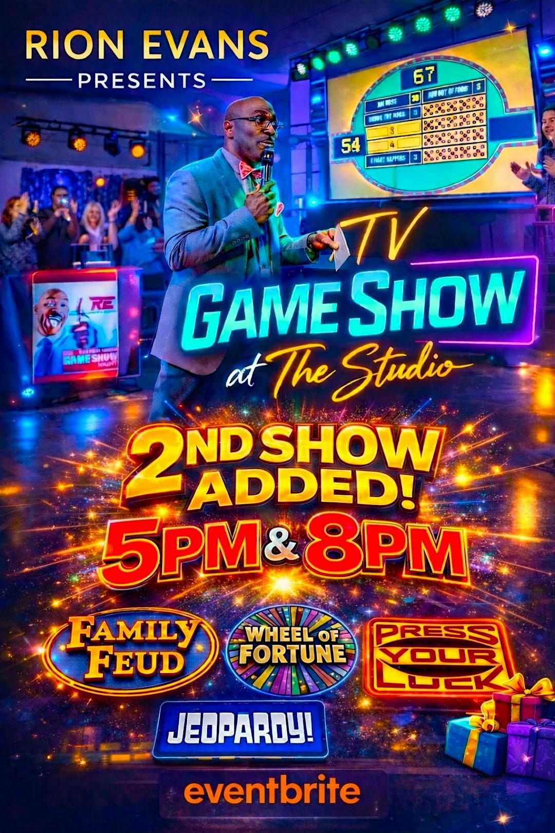 Rion Evans Presents TV GAME SHOW NIGHT at The Studio at Mainstreet !! Have you ever wanted to play your favorite games from TV? Now you can!! Play games like Family Feud, Wheel of Fortune, Jeopardy, Pyramid and Press Your Luck!!