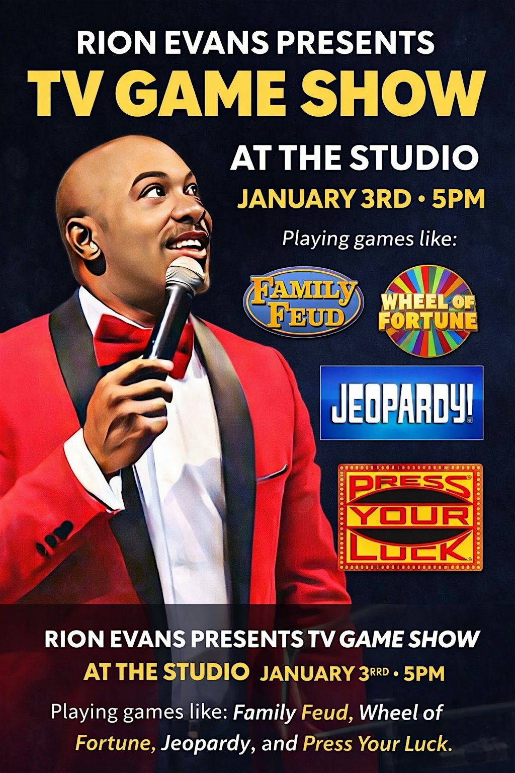 Join us in person for an unforgettable night of fun and excitement with RION EVANS bringing the ultimate game show experience straight to The Studio. Whether you’re a trivia buff or just looking for a good time, this event is the place to be. Grab your friends, bring your energy, and get ready to play, cheer, and laugh the night away!