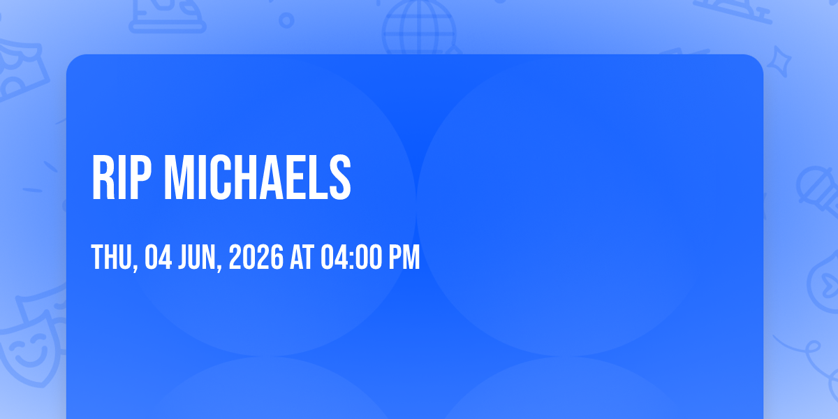 🎉 Prepare to be amazed at RIP Michaels, the most anticipated gathering of the season! 🌟 Set against the stunning backdrop of Tommy T's Comedy Club in vibrant Pleasanton, CA, this event promises to redefine your expectations. 📅 Mark your calendars for June 5th, 2026 at 04:00 PM and get ready to immerse yourself in an atmosphere of wonder and excitement. ✨ From the moment you arrive, you'll be transported into a world where memories are made and stories come alive. They have crafted an experience that perfectly harmonizes entertainment, innovation, and community spirit. 🌈 Join us as we create moments that will be discussed for years!http://maps.seatics.com/GeneralAdmissionEvent_VIP-GA_2021-02-02_2021-02-02_0918_05122024_161359_SVGC_tn.gif