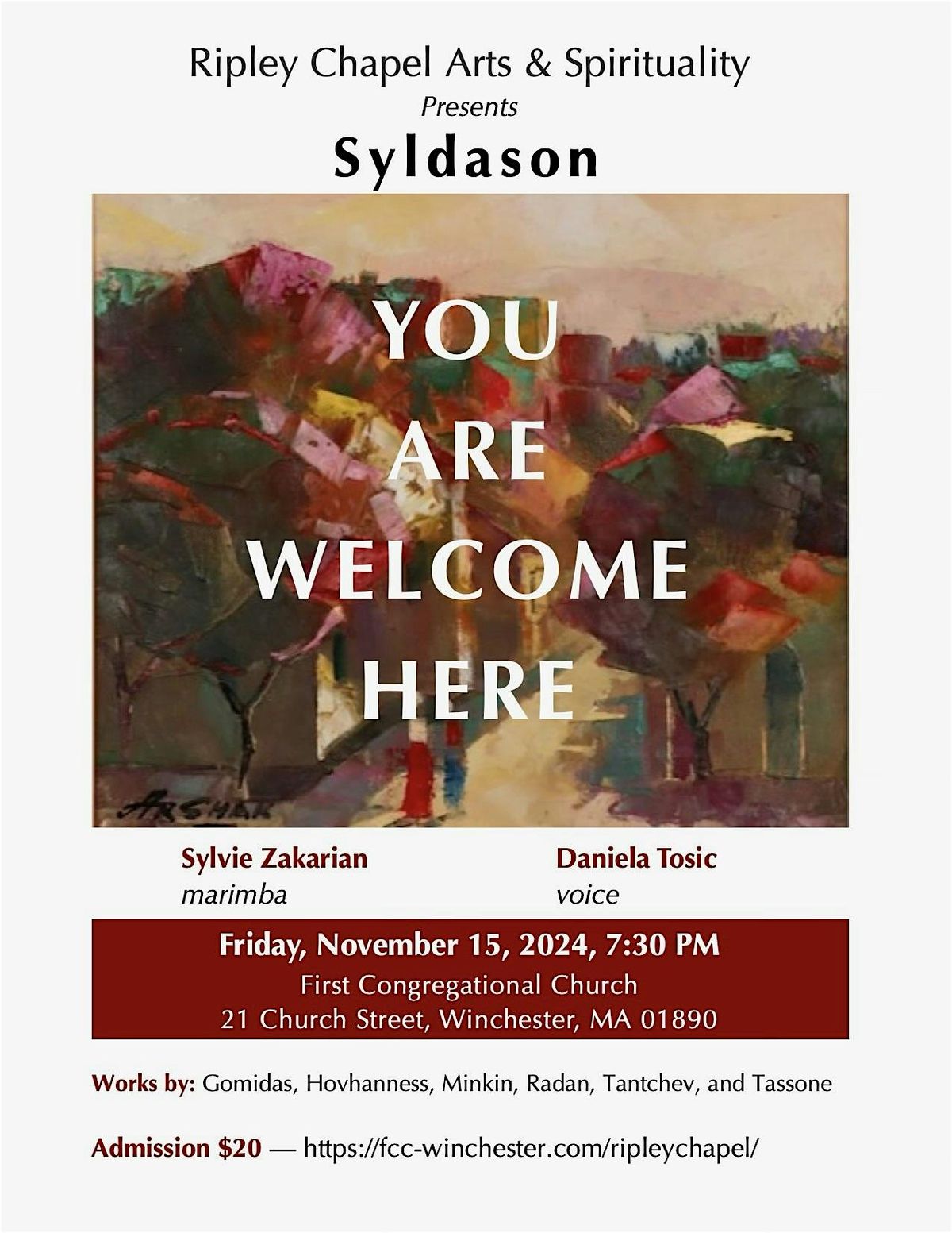 Live in-person and live streamed from the stunning Ripley Chapel at First Congregational Church, Winchester. Dedicated to the immigrant experience, please join us for Syldason, a duo concert featuring Sylvie Zakarian, marimba and Daniela Tosic, voice.
