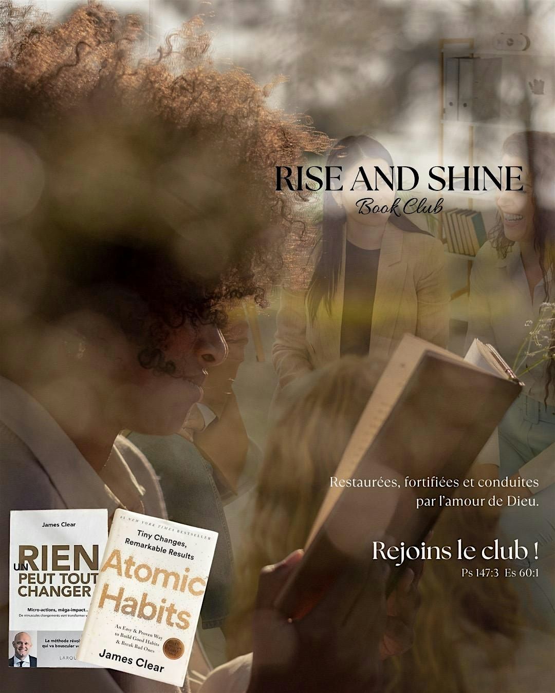 Le RISE AND SHINE BOOK CLUB est un club de lecture pour femmes dont la mission est d'emmener par la lecture intentionnelle de livres et par la méditation biblique à la restauration et la guérison intérieure pour une vie productive à la gloire de notre Seigneur Jésus.