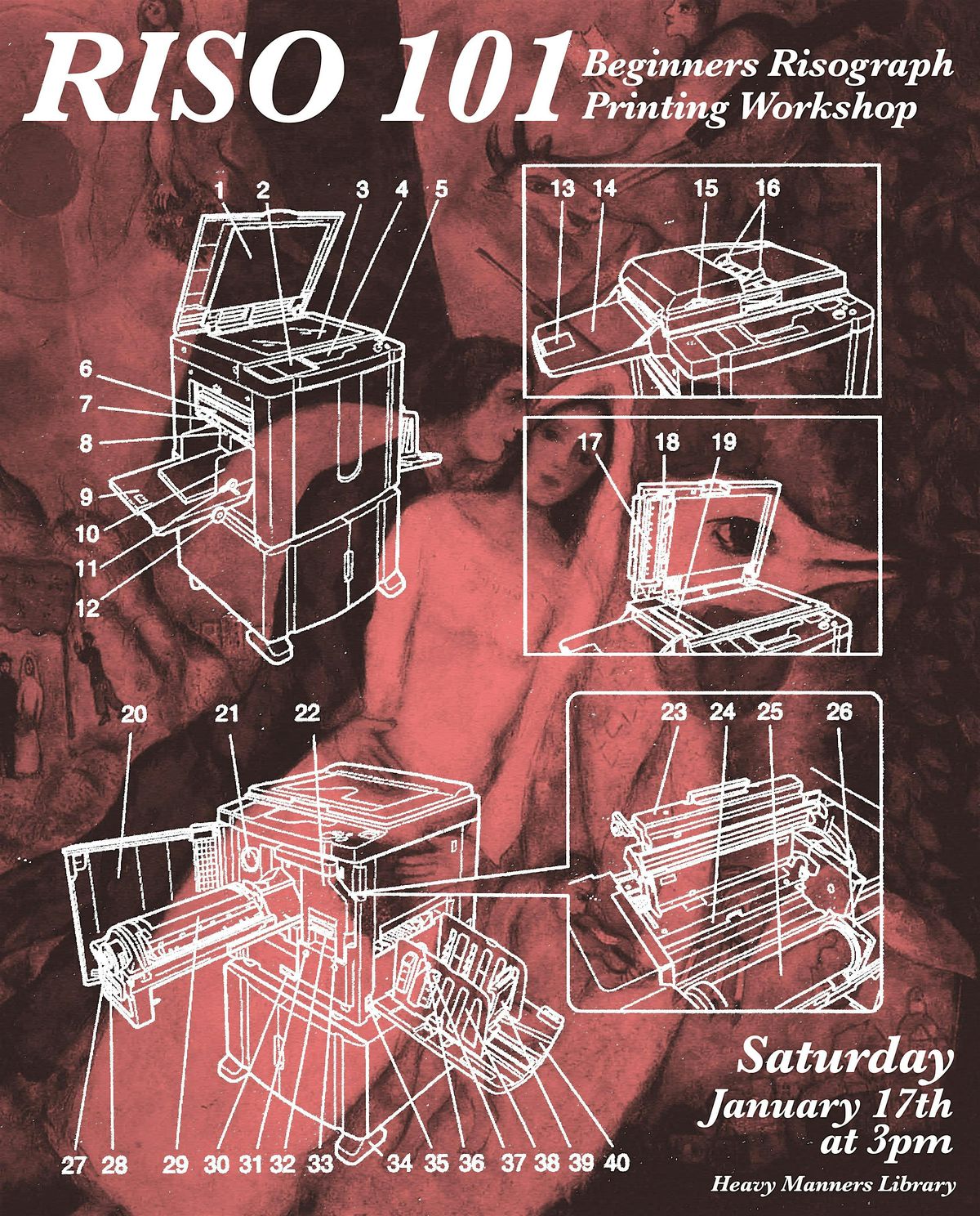Join us for an introductory workshop on risograph printing. Students will learn the basic mechanics and procedures of our risograph machine (an RZ390) and will have a chance to experiment with making their own simple 8.5x11 prints. Part of the class time will be dedicated to examining the ins-and-outs of the machine, and part of the class will offer time for students to make their own designs to scan and print. If you have files on your computer that you would like to experiment with, or if you want to make work on your computer or ipad to print, those are both options as well! But please understand with the class size and limitations of our machine that we can not guarantee that students will leave with exactly the print they envision if their concept is more ambitious than the class is designed for.