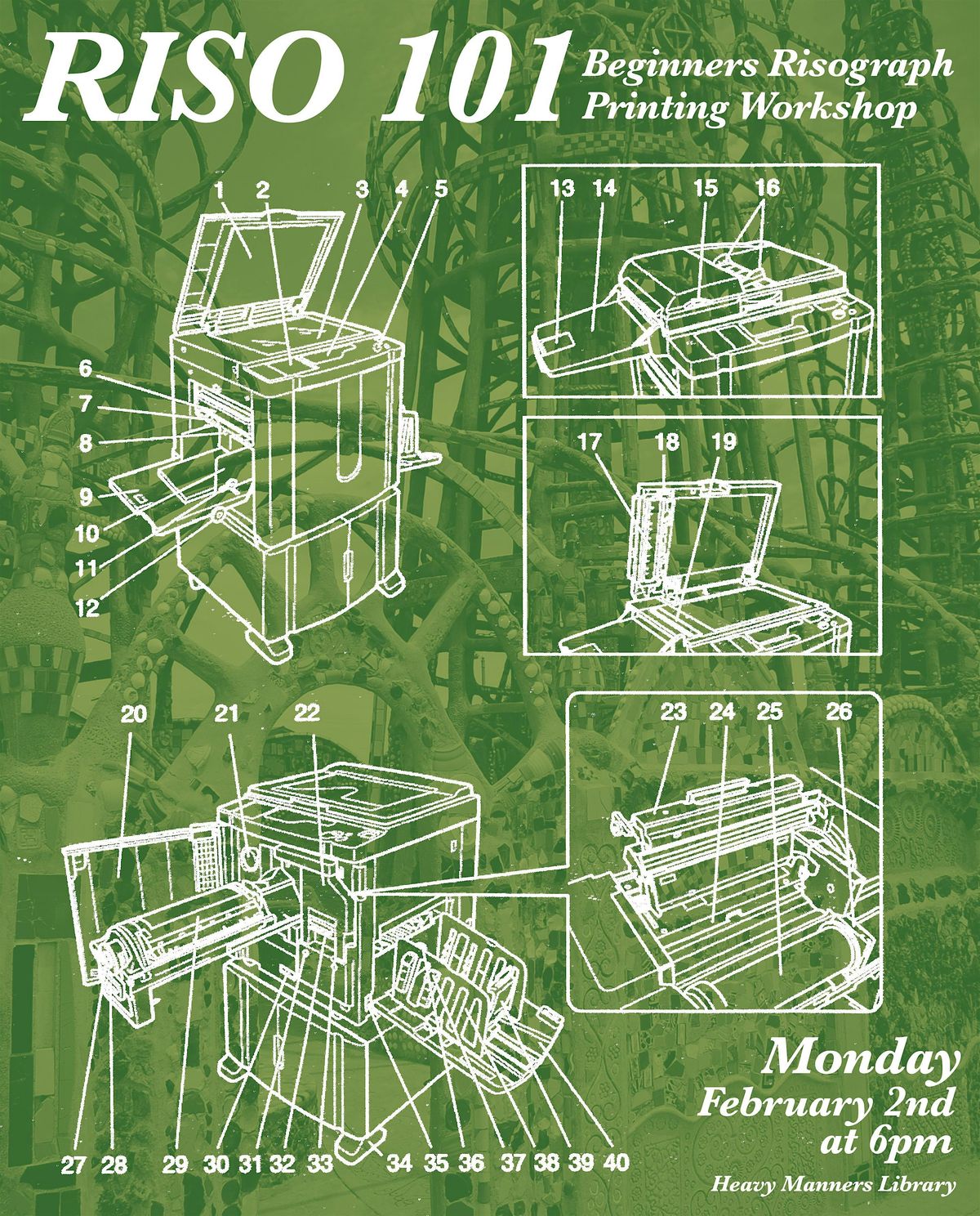 Join us for an introductory workshop on risograph printing. Students will learn the basic mechanics and procedures of our risograph machine (an RZ390) and will have a chance to experiment with making their own simple 8.5x11 prints. Part of the class time will be dedicated to examining the ins-and-outs of the machine, and part of the class will offer time for students to make their own designs to scan and print. If you have files on your computer that you would like to experiment with, or if you want to make work on your computer or ipad to print, those are both options as well! But please understand with the class size and limitations of our machine that we can not guarantee that students will leave with exactly the print they envision if their concept is more ambitious than the class is designed for.
