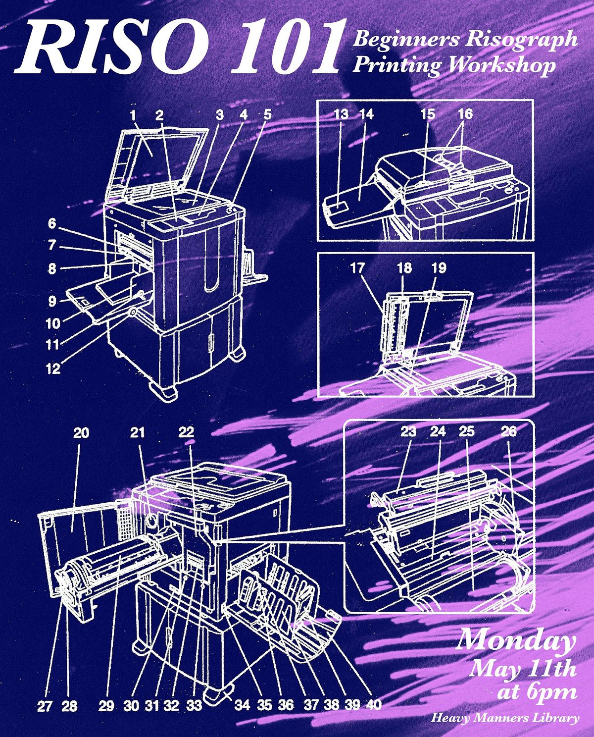 Join us for an introductory workshop on risograph printing. Students will learn the basic mechanics and procedures of our risograph machine (an RZ390) and will have a chance to experiment with making their own simple 8.5x11 prints. Part of the class time will be dedicated to examining the ins-and-outs of the machine, and part of the class will offer time for students to make their own designs to scan and print. If you have files on your computer that you would like to experiment with, or if you want to make work on your computer or ipad to print, those are both options as well! But please understand with the class size and limitations of our machine that we can not guarantee that students will leave with exactly the print they envision if their concept is more ambitious than the class is designed for.
