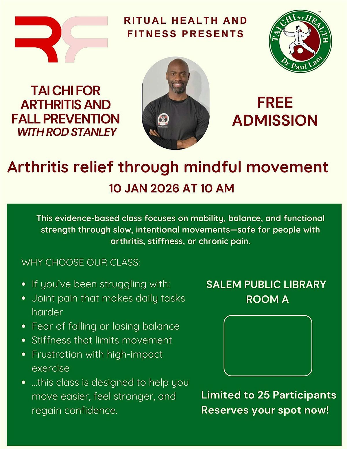 Join us in person for a relaxing and fun Tai Chi for Arthritis demo! Whether you're new to Tai Chi or looking to improve your wellness routine, this event is perfect for all levels. Experience gentle movements designed to boost balance, flexibility, and joint health in a friendly atmosphere. Don't miss out on this chance to learn some mindful exercises and connect with others interested in staying active and healthy!
