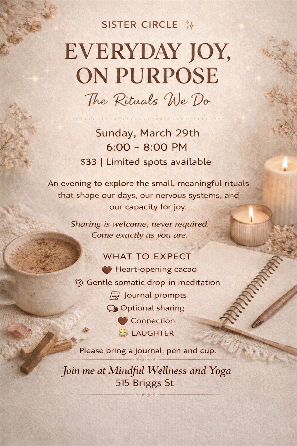 ister Circle: Everyday Joy, On Purpose ✨ Cacao, somatic meditation & connection. Sunday 3/29, 6–8 PM at Mindful Wellness & Yoga. Limited spo