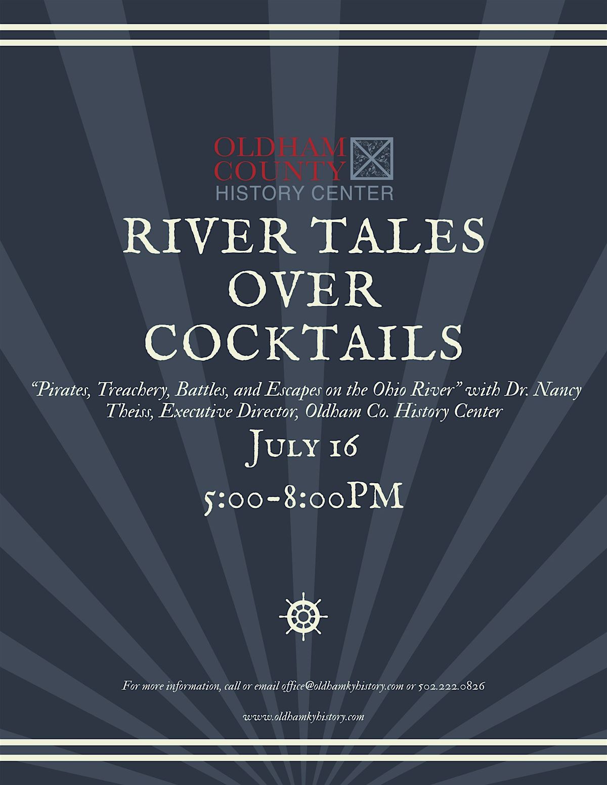 Part 3 of our River Tales Over Cocktails history cruise series aboard the CQ Princess. Boarding begins at 5:00pm at Captain's Quarters on River Rd. Part 3 will feature Dr. Nancy Theiss, Executive Director of the Oldham COunty History Center and her talk, "“Pirates, Treachery, Battles, and Escapes on the Ohio River".
