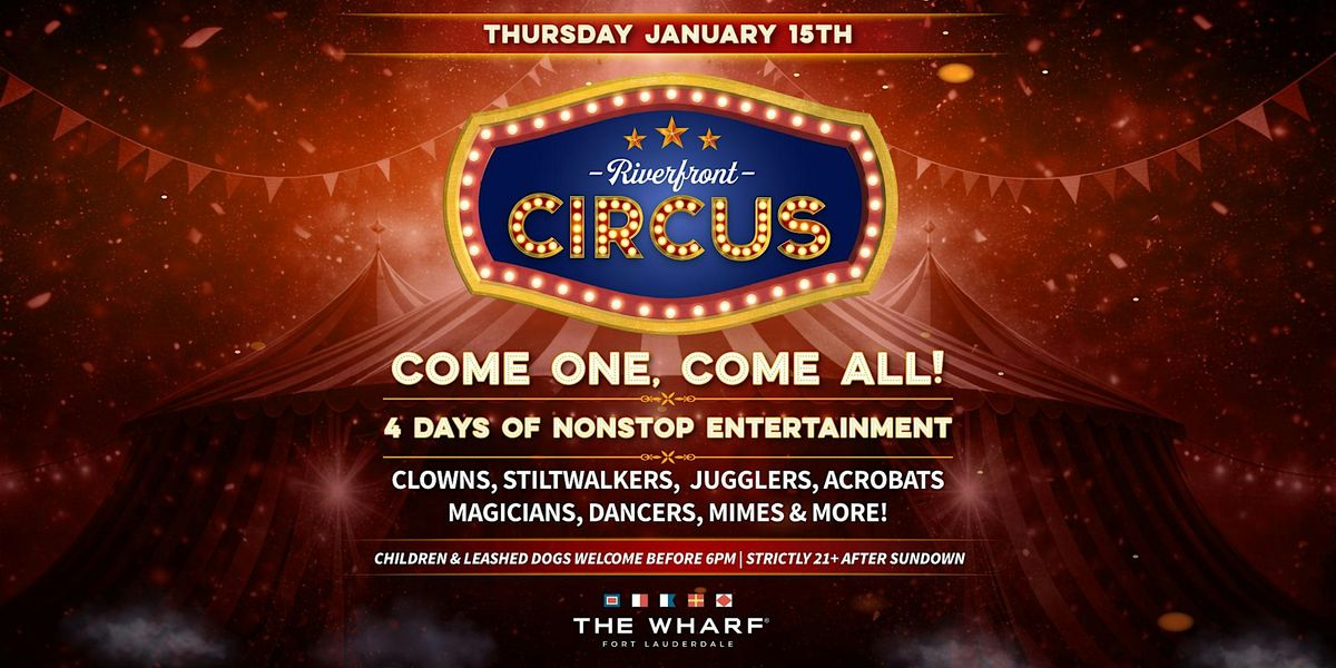 The Riverfront Circus returns to The Wharf Fort Lauderdale, kicking off four unforgettable days of high-energy entertainment along the New River. Opening Day sets the stage with jaw-dropping performances from clowns, stilt walkers, jugglers, acrobats, magicians, dancers, and mimes. Expect laughter, amazement, and nonstop fun as the circus comes alive right on the waterfront. Don’t miss the grand opening of this must-see event!